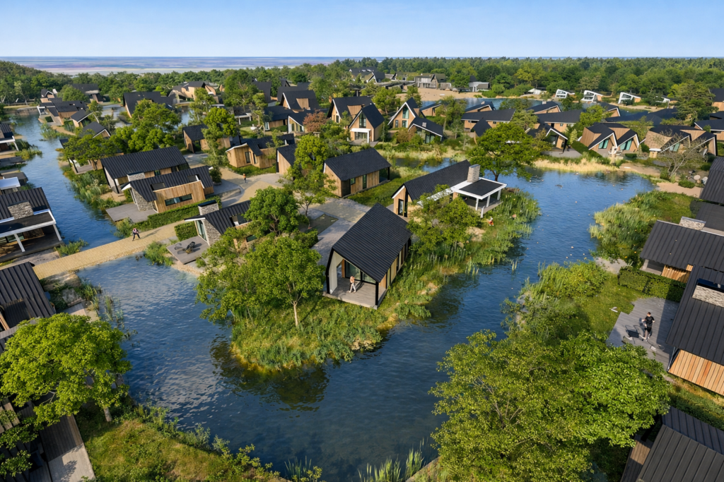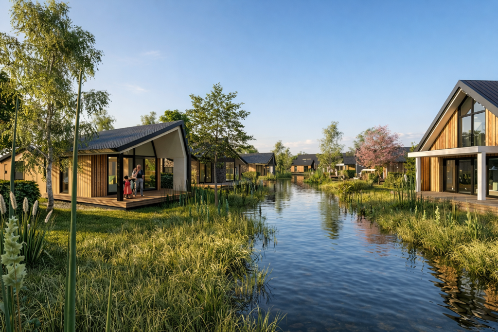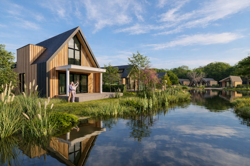 Eco-resort Drentse Weelde is schitterend gelegen in Hoogersmilde, direct aan de rand van het Nationaal Park Drents-Friese Wold. Deze unieke, waterrijke locatie biedt een perfecte combinatie van luxe en duurzaamheid voor wie op zoek is naar een waardevaste investering of een tweede thuis. Het is een modern en natuurvriendelijk resort waar rust en ruimte centraal staan en waar de adembenemende uitzichten over het water u direct een vakantiegevoel geven.